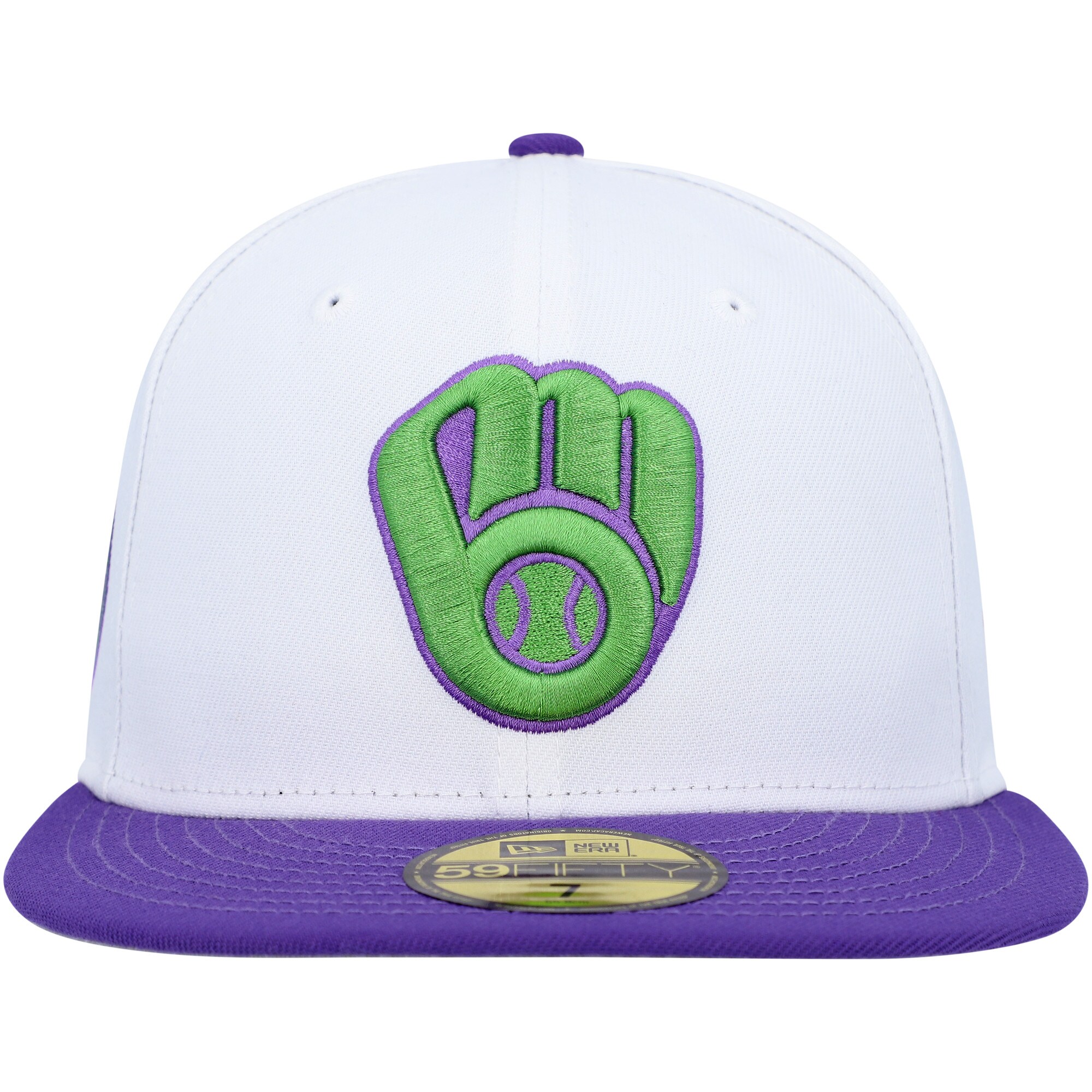 Add a snazzy hat to your lineup of Milwaukee Brewers gear by grabbing this 50th Anniversary Side Patch 59FIFTY fitted hat from New Era. The purple and green embroidery pops off the solid white panels for a bold addition to any game day look. The fitted construction provides a consistent wear each time you reach for this cap.